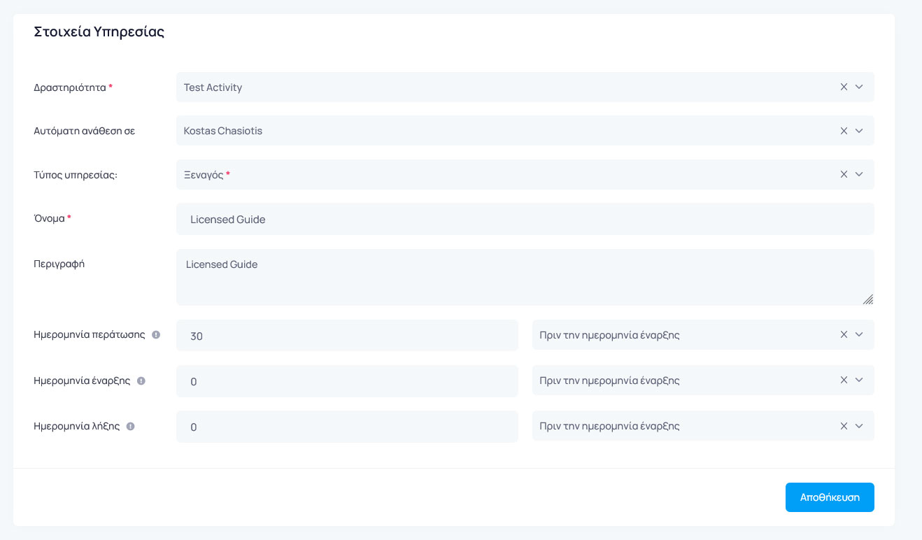 • Ημερομηνία λήξης: Πόσες μέρες πριν/μέτα την ημερομηνία της εκδρομής η υπηρεσία λήγει. Για υπηρεσίες που γίνονται την ίδια ημέρα με την εκδρομή, μπορείτε να βάλετε την τιμή μηδέν.