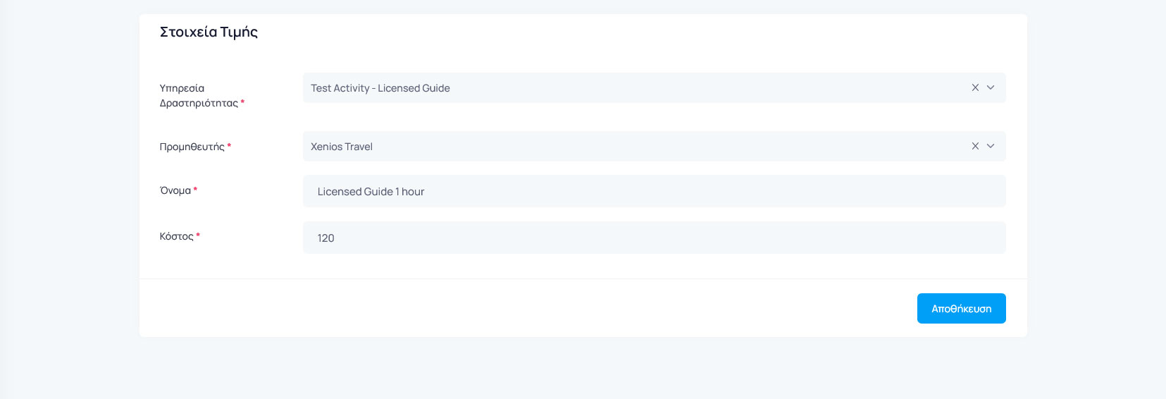 Στη σελίδα των τιμών της υπηρεσίας, μπορείτε να συμπληρώσετε τα παρακάτω στοιχεία: