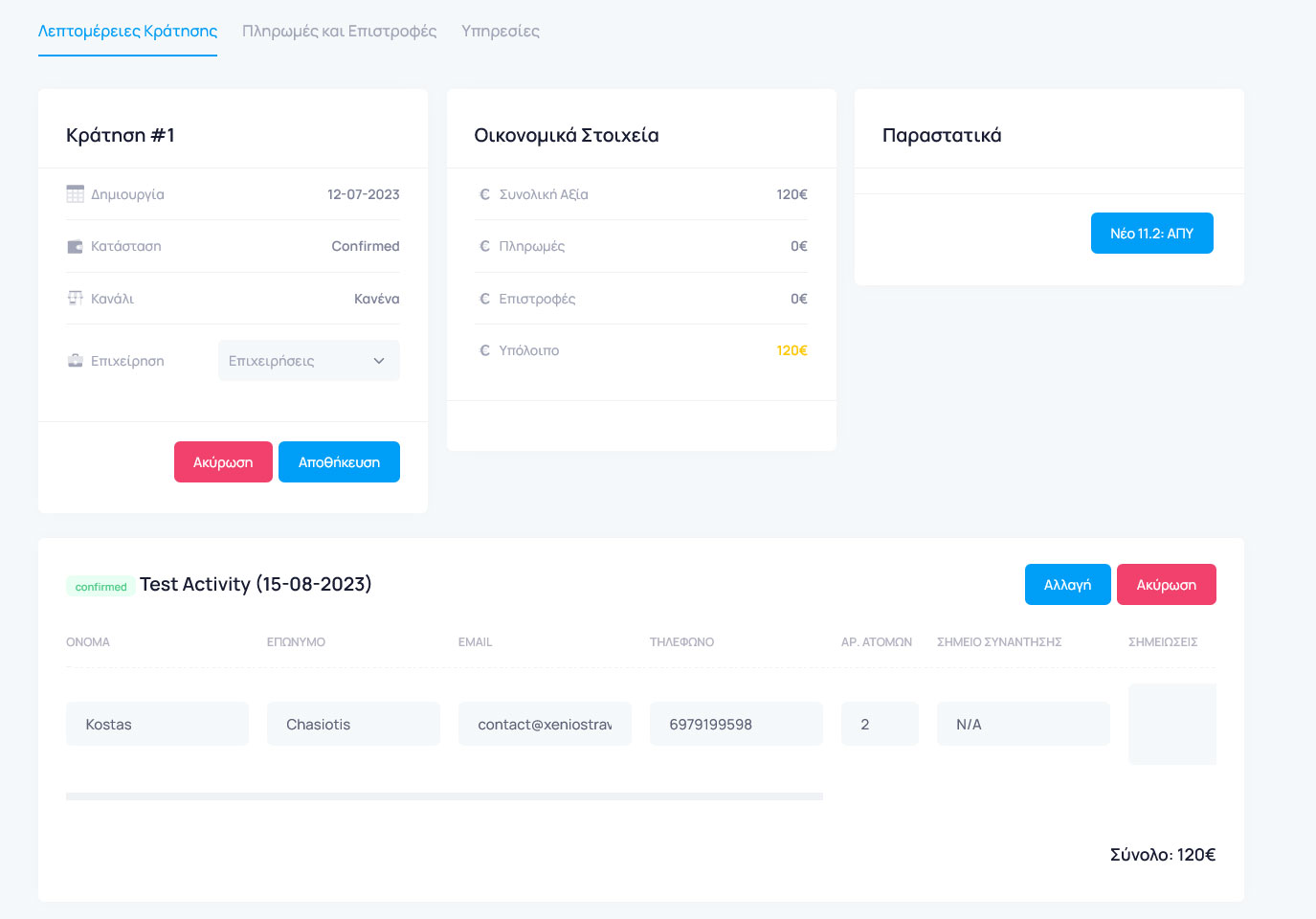 Επιλέξτε την καρτέλα "Πληρωμές και Επιστροφές". Εκεί, μπορείτε να δείτε όλες τις πληρωμές και τις επιστροφές που έχουν γίνει για τη συγκεκριμένη κράτηση. Μπορείτε να προσθέσετε μία πληρωμή πατώντας το κουμπί "Προσθήκη Πληρωμής". Επιλέξτε την ημερομηνία, το ποσό και τον τρόπο πληρωμής και πατήστε το κουμπί "Αποθήκευση". Η πληρωμή έχει δημιουργηθεί και το υπόλοιπο έχει ενημερωθεί.