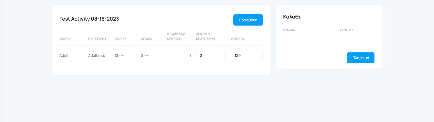 Σε αυτήν τη σελίδα θα βρείτε μία λίστα με όλες τις εκδρομές ανά ημερομηνία. Μπορείτε πολύ εύκολα να επιλέξετε την εκδρομή που θέλετε για την ημερομηνία που επιθυμείτε να κάνετε την κράτηση από το πάνω μέρος της σελίδας. Στη συνέχεια, πατώντας το κουμπί με το καλάθι, θα μεταφερθείτε στη σελίδα που μπορείτε να επιλέξετε τις κατηγορίες τιμών για τις οποίες θέλετε να κάνετε την κράτηση. Μόλις συμπληρώσετε όσες κατηγορίες θέλετε, πατήστε το κουμπί "Προσθήκη".