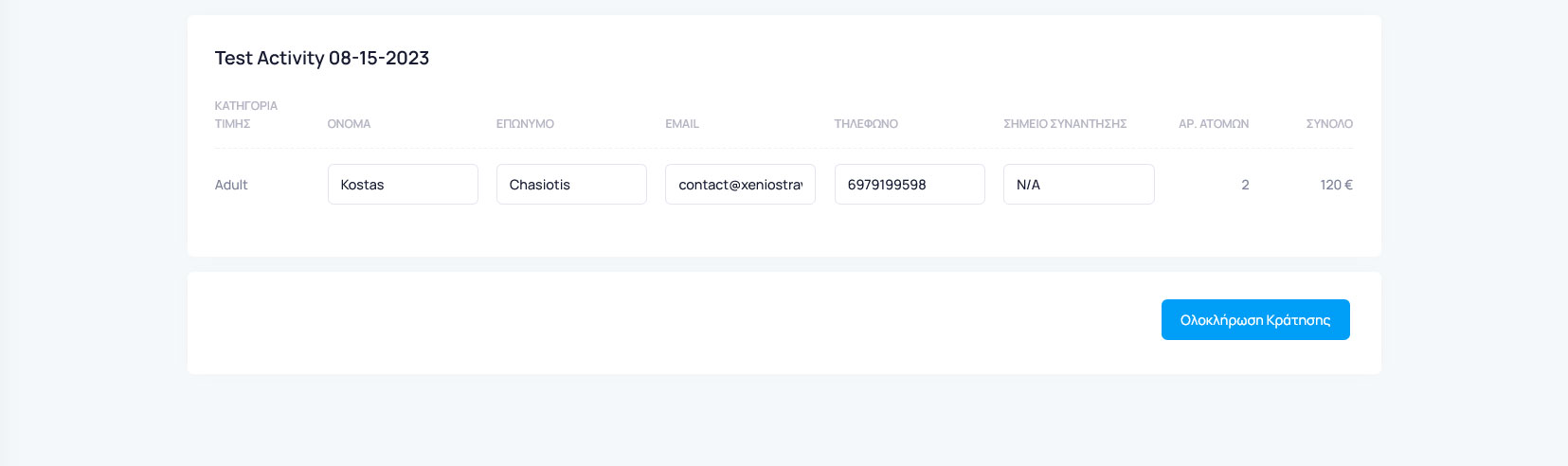 Στη σελίδα της ολοκλήρωσης της κράτησης, μπορείτε να συμπληρώσετε τα στοιχεία επικοινωνίας των πελατών: